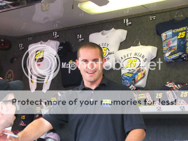 We walked around the souvenir rigs with Mom. Jessi bought a Mikey bear keychain and talked with his rig woman, Phyllis, for quite some time about RaceWorld. She even gave us a pamphlet! I got a nice Team Red Bull tank top and was pleased to see that they make shirts small enough to fit me. Somehow I forgot to buy a hat too. Jessi then purchased two Casey shirts.